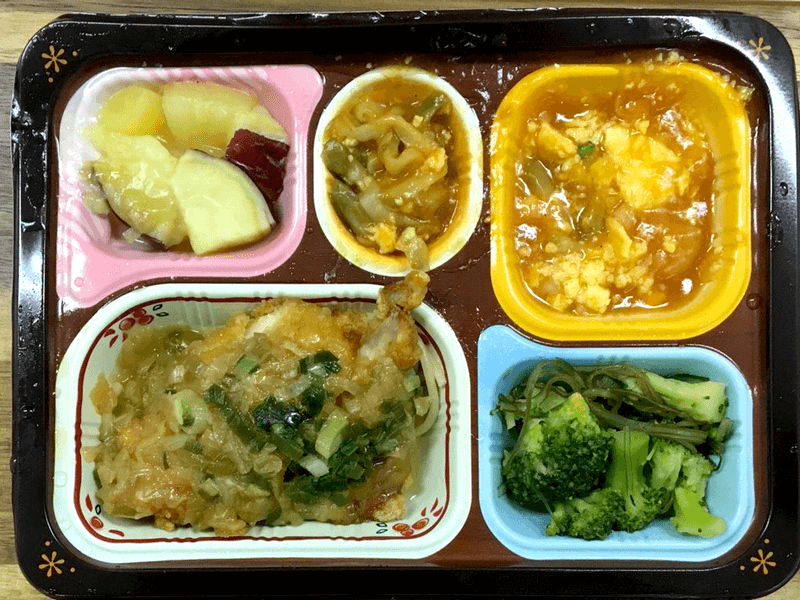 鶏唐揚の葱甘酢がけがメイン料理の中華風冷凍弁当です。副菜にはさつまいも、ザーサイ炒め、エビチリ、ブロッコリーと昆布の炒め物の4品が入っていました。